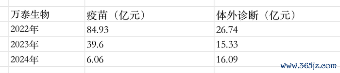 回看万泰生物上市以来的表现,2022年疫苗、体外诊断业务营收分别为84.93亿元、26.74亿,2023年分别为39.6亿元、15.33亿元,2024年分别为6.06亿元、16.09亿元。可见,两个业务都出现了下滑,但疫苗业务的滑落更为明显。