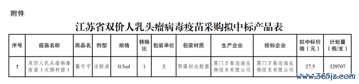 在2025年4月23日,江苏省公共资源交易中心披露“关于公示江苏省双价人乳头瘤病毒疫苗采购结果的通知”, 拟中标产品系馨可宁双价HPV疫苗,拟中标价格显示为27.5元/瓶支。